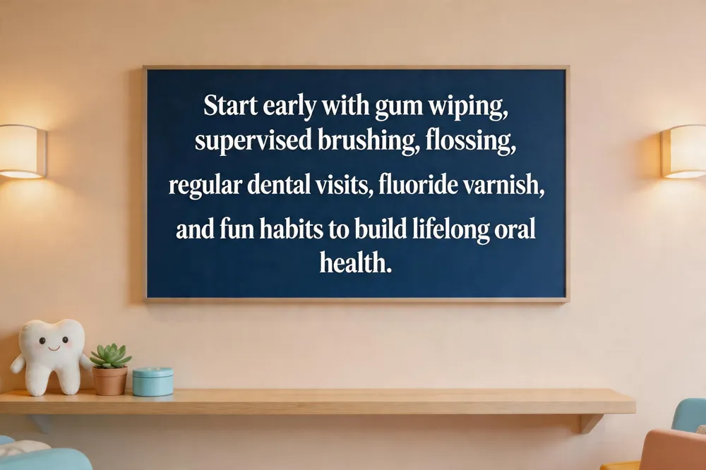 Oral health tips for children start the moment your baby is born. Wipe the infant’s gums with a soft, damp cloth to remove bacteria until the first teeth erupt. Once teeth appear, begin supervised brushing twice a day with a soft, small‑bristled toothbrush and a pea‑sized amount of fluoride toothpaste; parents should guide the child until they can brush effectively, usually around age 8. Schedule the first dental visit by the child's first birthday, and maintain regular six‑month check‑ups. During these visits the dentist can apply fluoride varnish and sealants to protect vulnerable enamel. Introduce flossing as soon as two teeth touch (about 8‑12 months) and make brushing fun with songs, timers, or sticker charts. Encourage a balanced diet low in sugary and starchy snacks and promote drinking fluoridated tap water to strengthen enamel. Monitor oral habits, address any injuries promptly, and keep the routine consistent to ensure a healthy, bright smile for life.