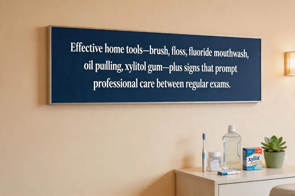 Effective home‑care tools: a brush used for two minutes twice at a 45° angle with fluoride toothpaste. Follow with flossing or a water‑flosser and an alcohol‑free fluoride mouthwash. Add oil pulling (sesame or coconut oil 15‑20 min) and sugar‑free xylitol gum after meals to boost saliva and neutralize acids.