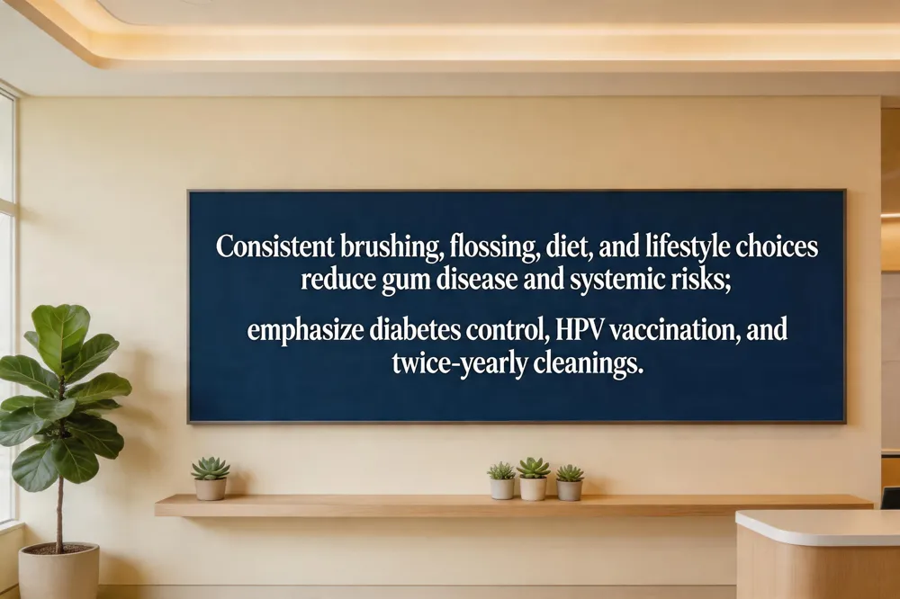 Maintaining a healthy mouth is essential for overall well‑being. Adults should brush twice daily with a soft‑bristled toothbrush and fluoride toothpaste using a 45‑degree angle and gentle circular strokes for at least two minutes, and floss every day to clear plaque from between teeth and along the gum line. Limit sugary and acidic foods, stay hydrated with fluoridated water, chew sugar‑free gum after meals, and keep the mouth moist to counteract dry‑mouth side effects of medications. Avoid tobacco and excessive alcohol both of which raise the risk of gum disease, oral cancer, and systemic conditions such as cardiovascular disease. Chronic illnesses—especially diabetes—worsen gum health, so tighter blood‑sugar control and more frequent professional cleanings (at least twice a year) are recommended. Finally, receive the HPV vaccine to lower the chance of HPV‑related throat and oral cancers, reinforcing the link between oral hygiene and systemic health.