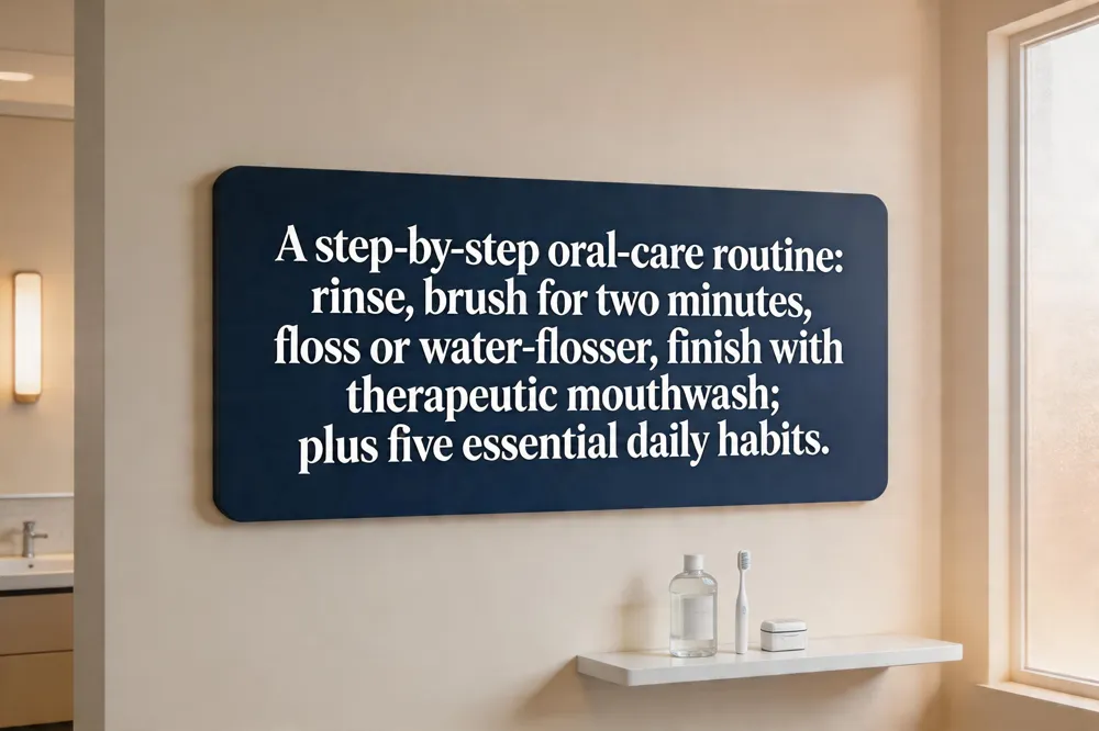 A solid oral‑care routine follows a simple order that maximizes protection. Begin by rinsing with water or an alcohol‑free antibacterial mouthwash to loosen debris and lower bacterial load. Brush for a full two minutes using a soft‑bristled brush, fluoride toothpaste, and gentle 45° circular motions that cover every tooth surface and the tongue. Follow with Floss or a water‑flosser, using a C‑shaped motion to clear plaque from between teeth and below the gum line. If desired, finish with a brief therapeutic mouthwash rinse for extra cavity and gum‑disease defense.