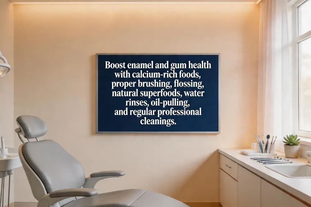 Eat a calcium‑rich, vitamin D‑packed diet—dairy, leafy greens, almonds, salmon, and unsweetened yogurt to reinforce enamel and support gums.