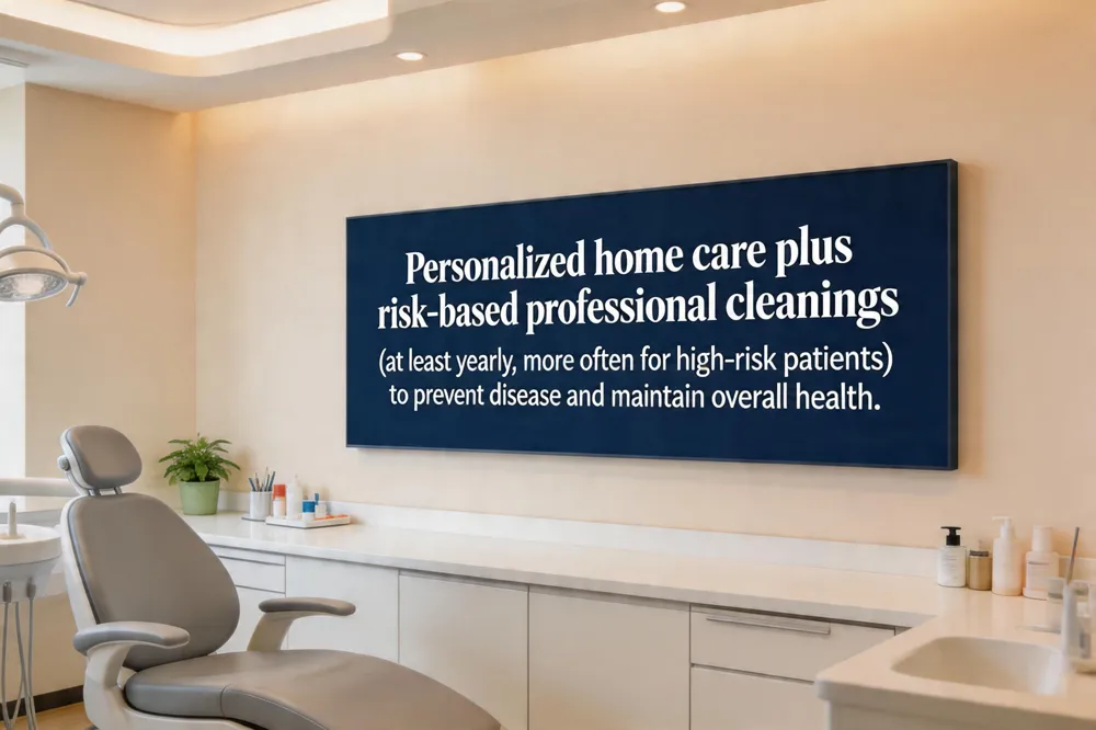 A risk‑based schedule of professional cleanings—often at least once a year, more often for those with diabetes, periodontal disease, or frequent cavities—allows early detection of problems and supports long‑term oral and overall health.