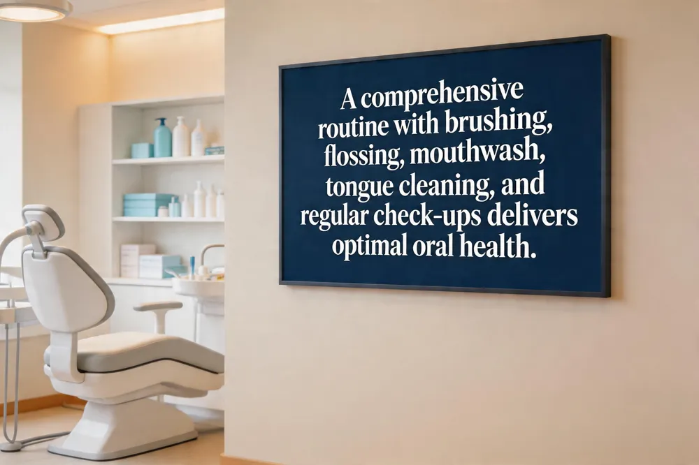 Oral Hygiene Routine Order Start with a quick rinse, then floss or water‑floss, brush for two minutes with fluoride toothpaste, use an alcohol‑free therapeutic mouthwash, and finish with a tongue scrape or final fluoride rinse if recommended.