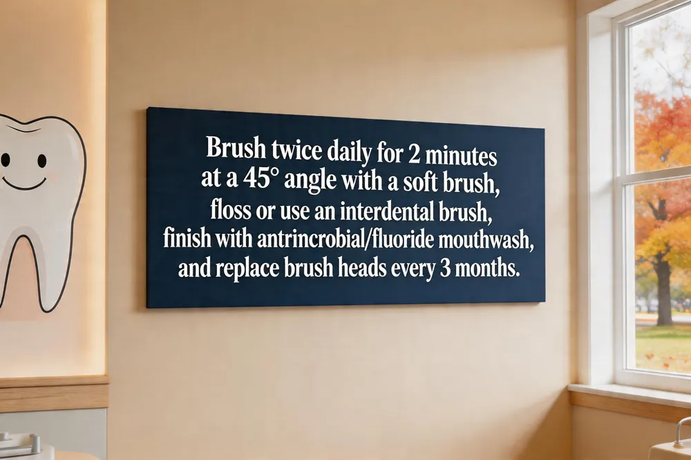 Actionable daily checklist – Brush twice a day for two minutes with a soft‑bristled brush at a 45° angle, using fluoride toothpaste. Floss or clean interdental spaces daily, and finish with an alcohol‑free antibacterial mouthwash. Chew sugar‑free gum or snack on crunchy fruits and vegetables to boost saliva, which neutralizes acids and helps keep enamel strong. Replace your toothbrush every three to four months.