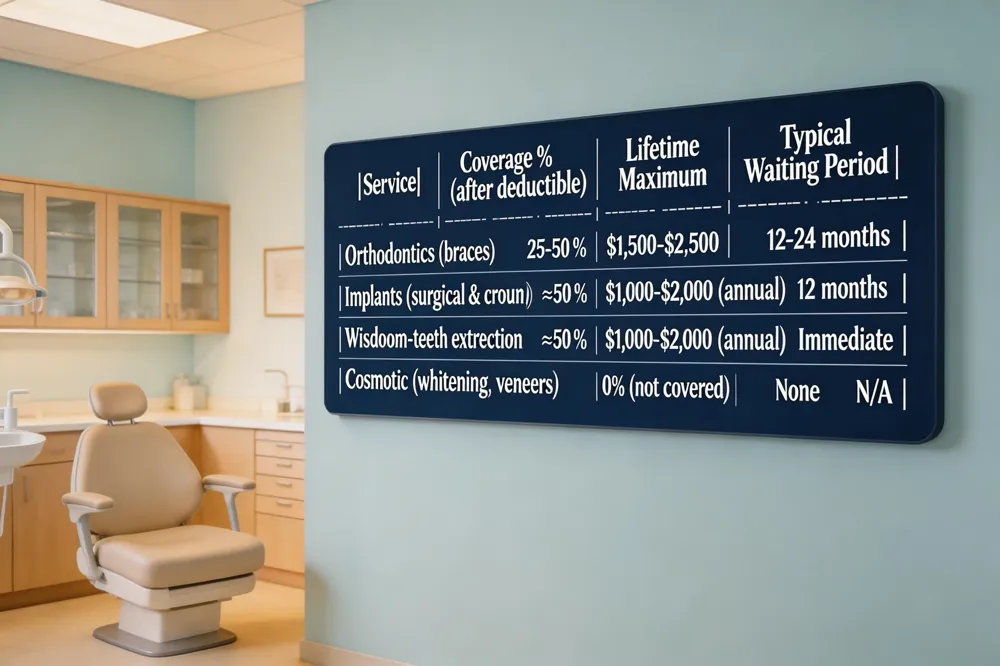What does dental insurance not cover? Purely cosmetic procedures—teeth‑whitening, bonding, veneers—are excluded. Adult orthodontics often requires a rider. Some plans limit or exclude implants, certain prosthetics, extensive periodontal surgery, and out‑of‑network care without prior authorization. Pre‑existing conditions are also typically not covered.