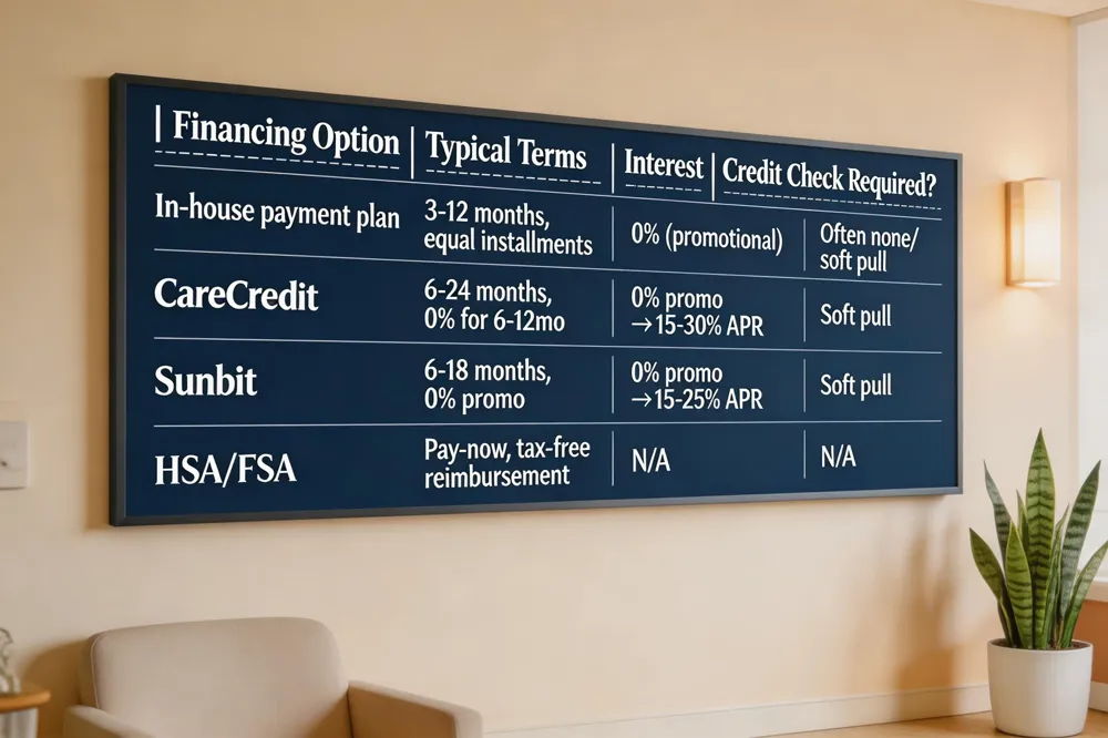 Explore payment‑plan or financing options – If your out‑of‑pocket balance exceeds coverage, discuss in‑office financing, CareCredit, Sunbit, or use an FSA/HSA for tax‑free payments.