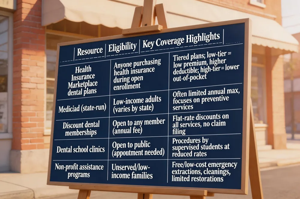 For families seeking affordable coverage, the Health Insurance Marketplace offers adult dental plans that can be added to a health plan during open enrollment. These plans come in high‑ and low‑coverage tiers; the low‑tier options have modest monthly premiums but higher deductibles and copayments, while the high‑tier plans provide lower out‑of‑pocket costs for preventive, basic, and major services.