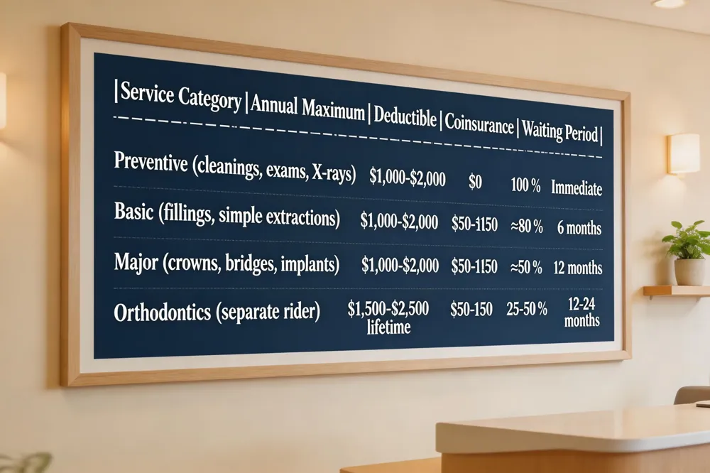 Dental plans set an annual benefit limit of $1,000‑$2,000 that resets each year; most use a “use‑it‑or‑lose‑it” rule. Deductibles range from $0 for preventive care to $50‑$150 for basic and major services and must be met before the insurer shares costs. Copayments are fixed fees; coinsurance is a percentage after the deductible—often 80 % for basic and 50 % for major procedures. Waiting periods are typical: preventive care is immediate, basic services may need 6 months, and major work such as crowns often needs 12 months.