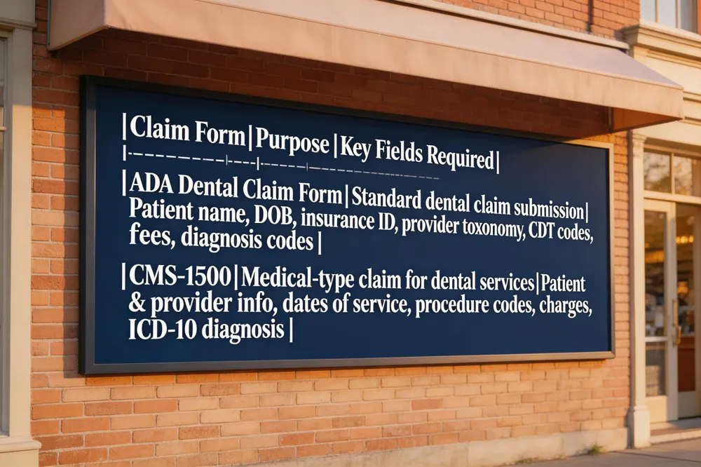 Dental offices use a few standardized claim forms to request payment from insurers. The most common are the ADA Dental Claim Form and the CMS‑1500, which capture the patient’s name, DOB, insurance ID, provider taxonomy code, treatment dates, CDT procedure codes, fees, and up to four diagnosis codes. Accurate completion of these fields is the first step to avoid claim denials.