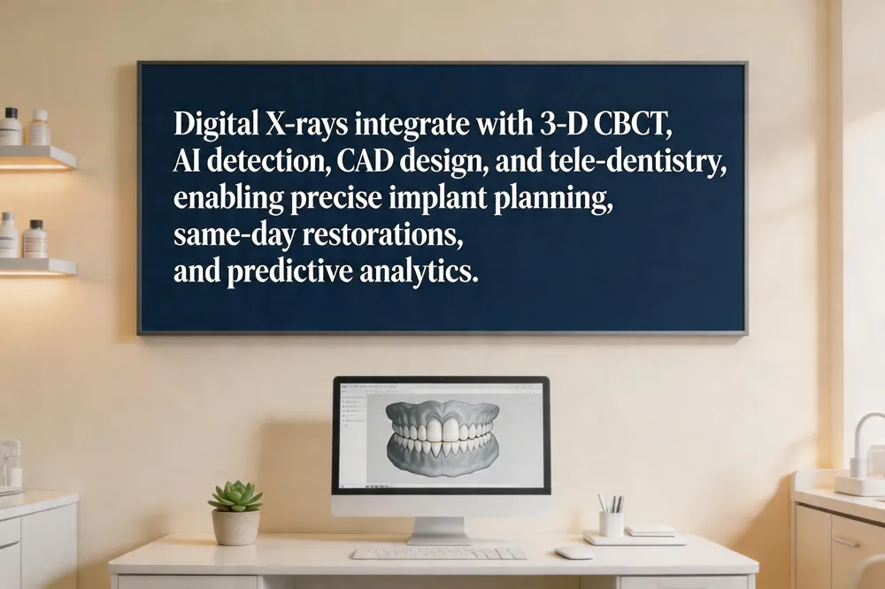 Digital X‑rays now serve as a gateway to cutting‑edge dental care. By linking the 2‑D sensor to 3‑D cone‑beam CT, clinicians can overlay the radiograph on a volumetric scan, enabling precise implant planning and accurate assessment of bone anatomy before surgery. AI‑driven algorithms automatically highlight early caries, subtle bone loss, and periapical lesions, giving the dentist a second set of eyes that speeds diagnosis and reduces missed pathology. Secure, encrypted transmission lets these enhanced images travel instantly to remote specialists, supporting tele‑dentistry consultations without compromising patient privacy. When a restoration is needed, the same digital file feeds directly into computer‑aided design (CAD) software, allowing same‑day milling of crowns, veneers or inlays and minimizing visits. Looking ahead, predictive analytics will mine longitudinal radiographic data to forecast disease progression, helping families adopt preventive measures before problems arise. Together, these innovations make dental treatment safer, faster, and more personalized.
