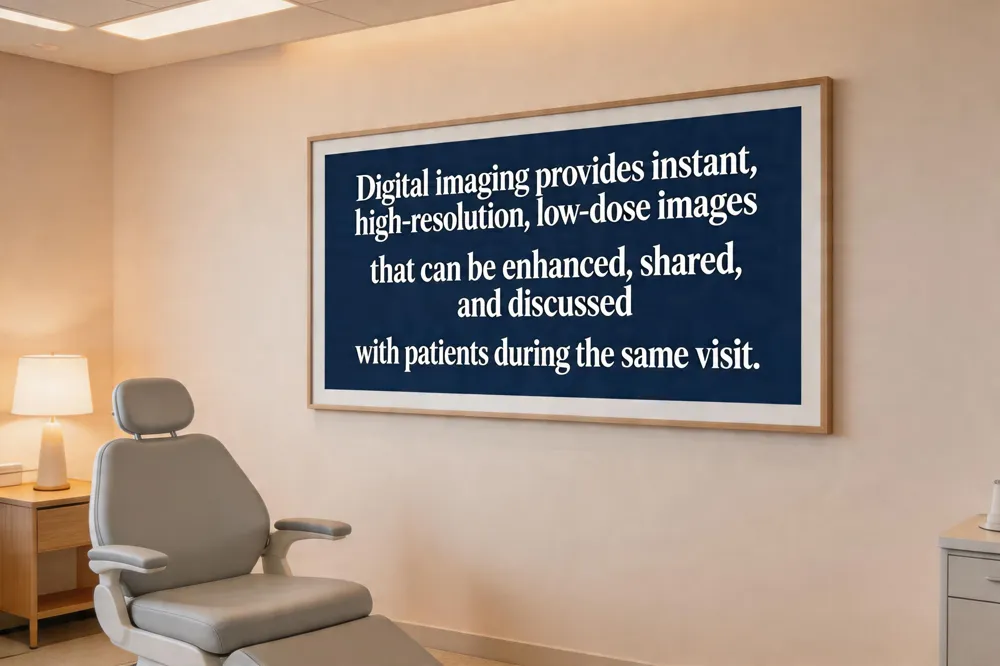 What are the advantages of digital imaging in dentistry? Digital imaging delivers instant, high‑resolution images with low radiation, eliminating film processing, reducing waste, and enabling easy enhancement and sharing for better communication and confidence.