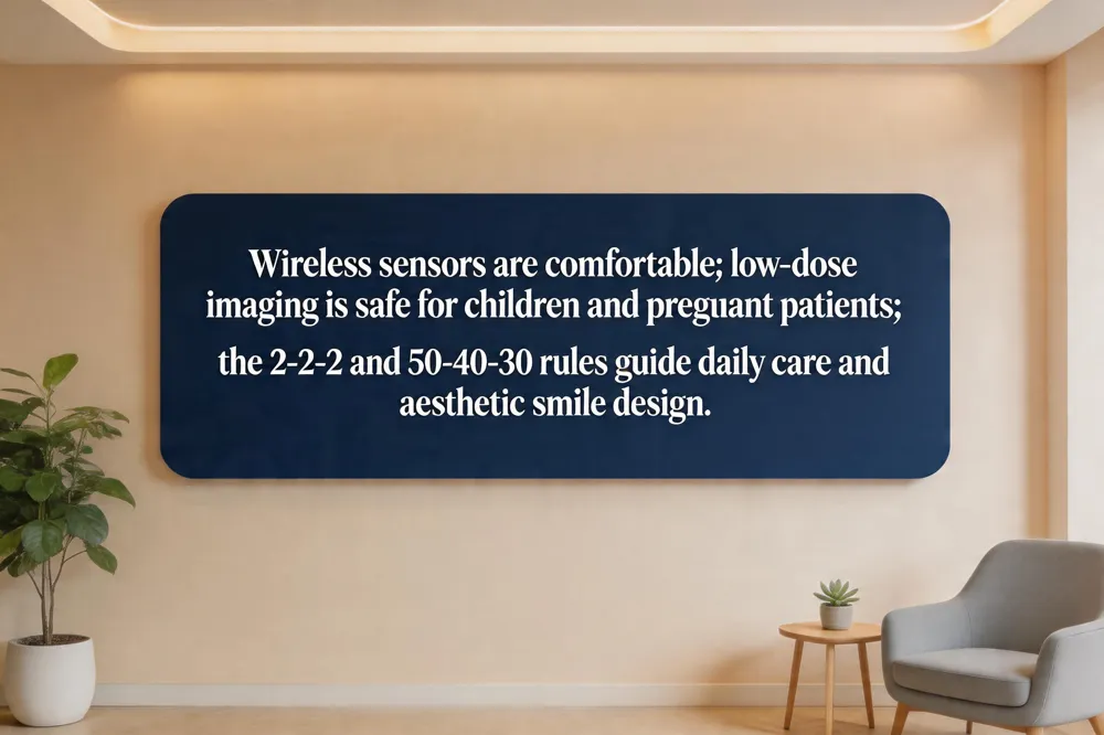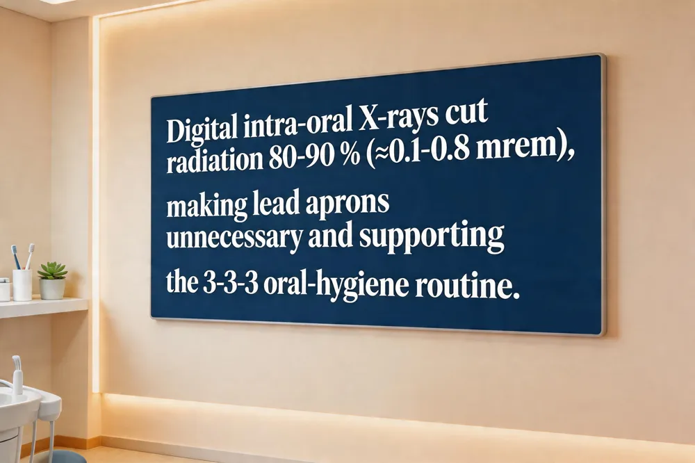 Digital sensors cut radiation by 80‑90 % versus film, so a single intra‑oral bite‑wing or periapical image delivers only 0.1–0.8 mrem—far less than a day of natural background exposure. This tiny dose makes routine lead aprons unnecessary; modern guidelines (AAOS, ACR) deem them redundant because the beam is tightly collimated and the ALARA principle is met. Faster‑speed film historically reduced exposure by 30‑60 %, but digital radiography now achieves even greater safety without sacrificing image quality. The smallest dose comes from digital intra‑oral X‑rays; panoramic or CBCT scans emit much more. For everyday oral hygiene, the 3‑3‑3 rule reminds patients to brush three times a day for three minutes and wait three hours after meals before bedtime, giving saliva a chance to protect enamel. In short, digital X‑rays are safer, faster, and more comfortable, supporting preventive care for families.