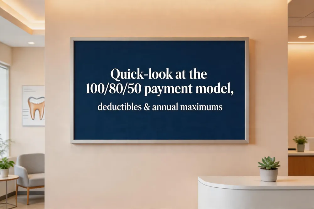Dental insurance is a monthly benefit that helps share the cost of oral‑health care after you meet any deductible. Most plans follow a 100/80/50 payment model: preventive services (cleanings, exams, X‑rays) are covered at 100 %, basic procedures such as fillings, simple extractions, and gum‑disease treatment at about 80 %, and major work like crowns, bridges, or dentures at roughly 50 %. A deductible is the amount you pay before the plan starts paying, and the annual maximum is the total the insurer will pay each year (often $1,000–$2,000). Out‑of‑pocket costs include copays, the uncovered percentage, and any expenses beyond the annual maximum.