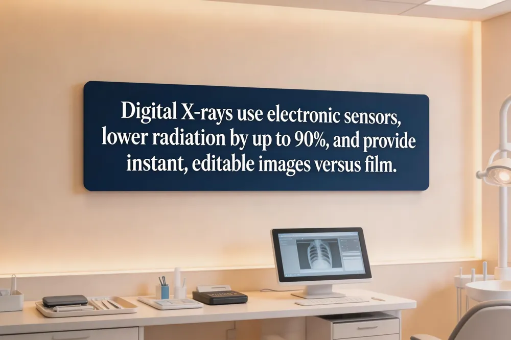 Digital X‑rays emit 50‑90 % less radiation, give high‑resolution images instantly, and allow contrast/brightness adjustments, improving early caries detection and treatment planning. Sensors are smaller, more comfortable, and images can be shared with specialists in seconds, enhancing patient education and confidence.