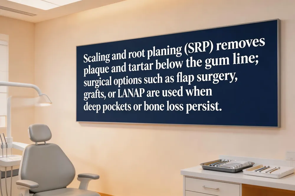 Non‑surgical therapies include SRP together with adjunctive measures such as antimicrobial mouth rinses, localized antibiotics, and patient‑specific oral‑hygiene instructions. When pockets remain deep or bone loss is evident, surgical options—pocket‑reduction flap surgery, bone or tissue grafts, guided tissue regeneration, or laser‑assisted new attachment (LANAP)—are employed to restore supporting structures.