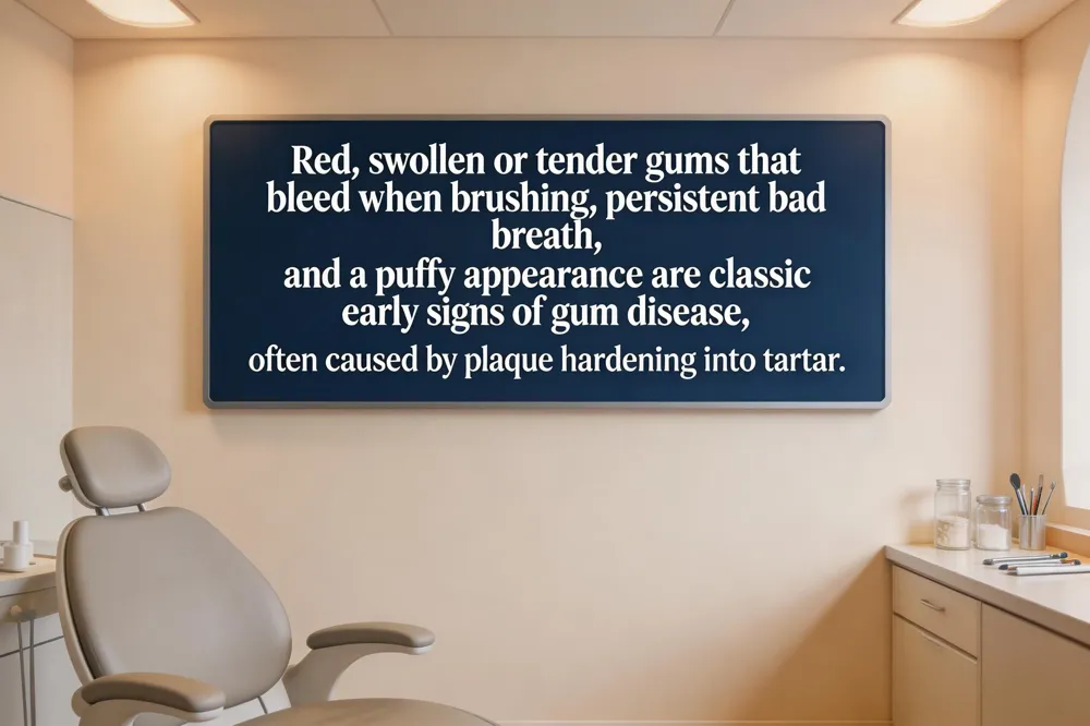 Early gum disease often shows up as red, swollen, or tender gums that bleed when you brush or floss, persistent bad breath, and a puffy appearance. The most common cause of gum swelling is plaque that hardens into tartar, irritating the gum tissue and leading to gingivitis; other triggers include an abscessed tooth, cracked roots, hormonal changes, ill‑fitting dentures or braces, and systemic factors such as diabetes, smoking, and certain medications.
