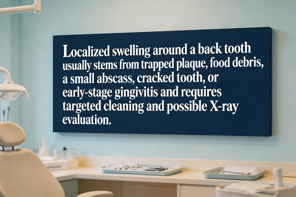 Why is my gum swollen around one tooth in the back? Localized swelling near a single back tooth is usually the result of trapped plaque, food debris, or a small infection such as an abscess. A cracked or loose tooth, an impacted wisdom tooth, or early‑stage gingivitis can also cause the gum to puffy and tender. Poor flossing habits, an over‑contoured filling, or hormonal changes may further irritate the tissue. Because the exact cause cannot be diagnosed visually, a thorough intra‑oral exam and an X‑ray at a periodontist (e.g., Dr. Maria Parrella) are essential to pinpoint the problem and plan appropriate care.