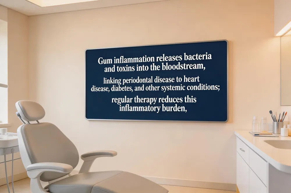 Periodontal disease is more than a local oral problem; it creates chronic inflammation that can affect the whole body. The bacteria that cause gum infection release toxins and inflammatory mediators that enter the bloodstream, contributing to systemic conditions such as cardiovascular disease and diabetes. Studies show that regular periodontal therapy—especially deep cleanings like scaling and root planing—lowers oral bacterial load, reduces gum inflammation, and can improve markers of systemic inflammation. For patients with heart disease, better gum health is linked to a modest reduction in atherosclerotic risk, while diabetic individuals often experience improved blood‑sugar control after consistent periodontal maintenance. In addition to protecting the teeth and supporting bone, ongoing therapy helps keep the body’s inflammatory burden in check, supporting overall health. Routine check‑ups, professional cleanings every three to six months, and diligent home‑care are essential steps for families who want to safeguard both their smiles and their long‑term well‑being.