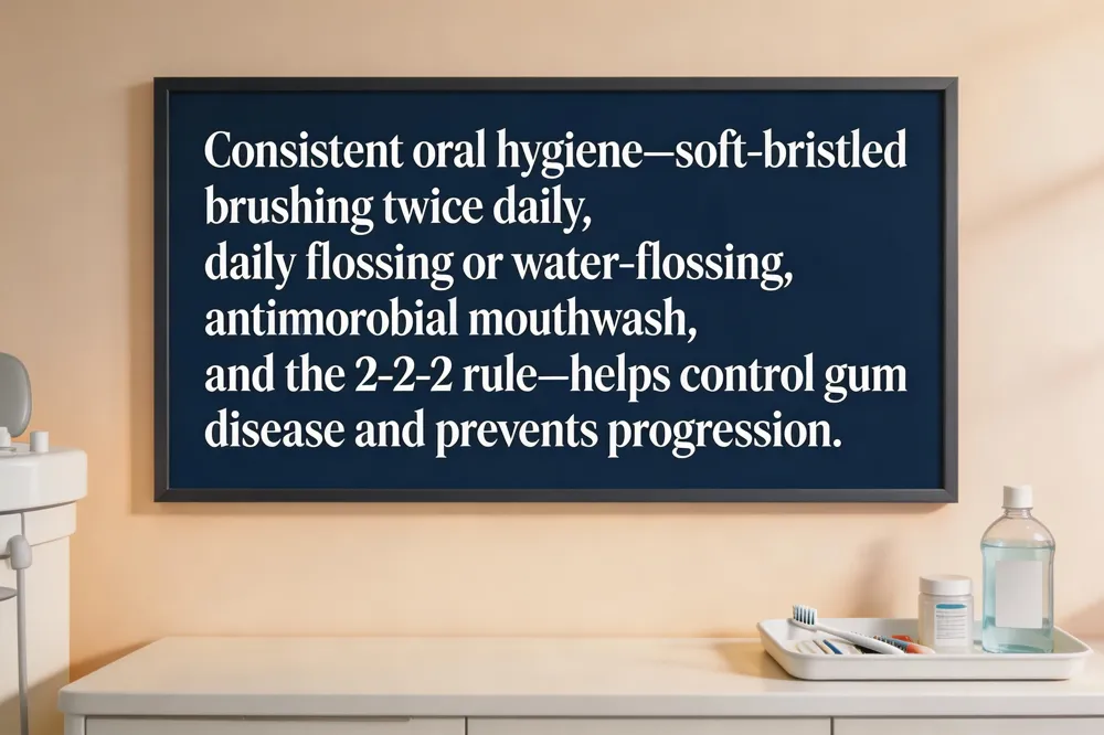 Self‑managed gum disease control begins with diligent oral hygiene. Brush twice a day with a soft‑bristled, fluoride toothpaste, floss or use a water flosser daily, and finish with an antimicrobial mouthwash to reduce plaque below the gum line. Eat a balanced diet rich in vitamin C, calcium, and whole grains while limiting sugary snacks and drinks that feed harmful bacteria. Over‑the‑counter antibacterial gels or therapeutic rinses can help control inflammation and keep gums moisturized.