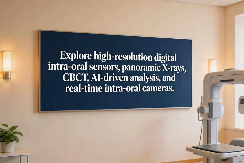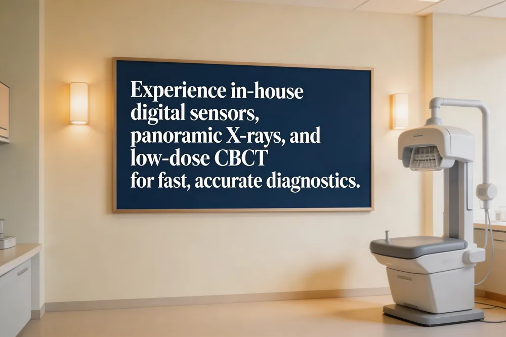 CBCT scanner: The on‑site cone‑beam computed tomography (CBCT) delivers three‑dimensional images with radiation doses far lower than conventional CT. This low3‑D view is essential for precise implant planning, orthodontic monitoring, TMJ assessment, and complex surgical cases. Results are available instantly, allowing the dentist to discuss treatment options and show the patient a visual model of their oral anatomy.