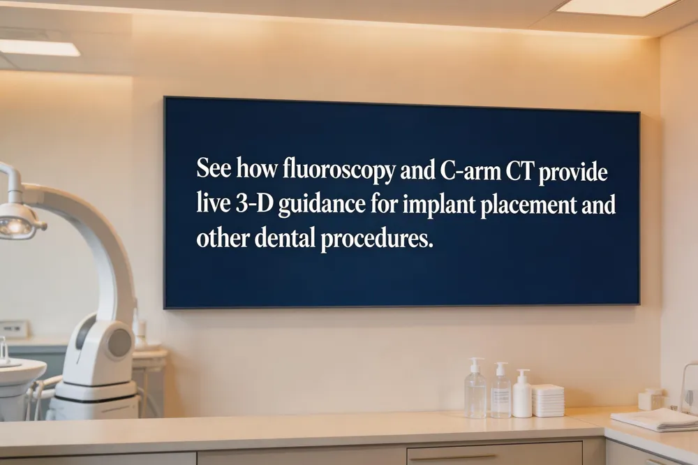 X‑ray fluoroscopy is a classic example of real‑time imaging, producing a continuous live view of internal structures as the X‑ray beam moves. In dentistry, fluoroscopic systems such as C‑arm CT can display three‑dimensional images instantly, helping clinicians guide procedures like implant placement with precise, dynamic feedback. Modern C‑arm CT uses flat‑panel detectors and automated exposure control, keeping the effective dose low (≈ 0.25 mSv for a 5‑second head scan), which aligns with the ALARA principle and is comparable to or lower than many cone‑beam CT protocols. This low‑radiation, real‑time capability lets the dentist monitor pilot drill positioning and implant insertion in the same appointment, reducing the risk of nerve injury, sinus perforation, or improper angulation. Because each frame is captured and projected in milliseconds, the clinician can adjust technique on the fly, shortening chair time and improving treatment accuracy. Patients benefit from a safer, faster workflow and can see the live images on a monitor, which enhances understanding of the procedure and builds confidence in their care.