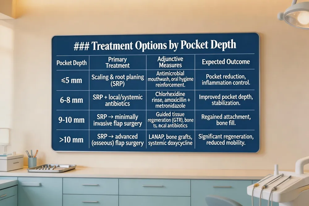 | Pocket Depth | Primary Treatment | Adjunctive Measures | Expected Outcome |