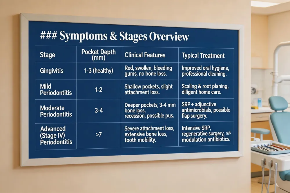 The disease follows a clear progression. Gingivitis is the first, reversible stage—gums are inflamed but no bone loss occurs. Continued plaque below the gum line leads to mild periodontitis (shallow pockets, 1‑2 mm attachment loss). It then moves to moderate periodontitis (deeper pockets, 3‑4 mm bone loss, possible recession and pus). The final stage, advanced (stage IV) periodontitis, shows attachment loss >7 mm, substantial bone loss, tooth mobility, and risk of loss.