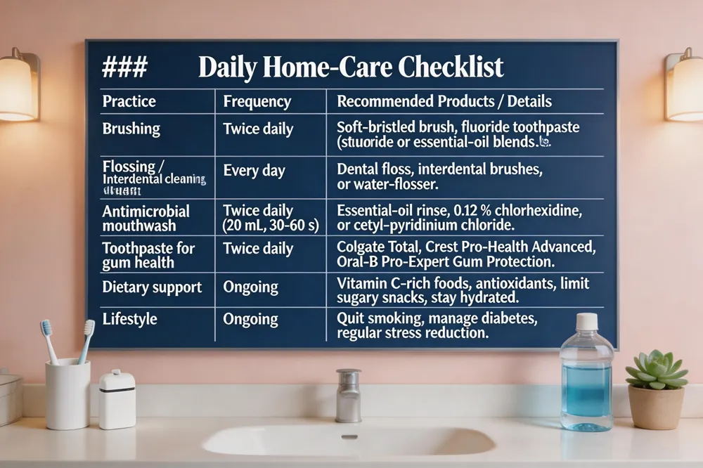 | Toothpaste for gum health | Twice daily | Products like Colgate Total, Crest Pro‑Health Advanced, Oral‑B Pro‑Expert Gum Protection. |