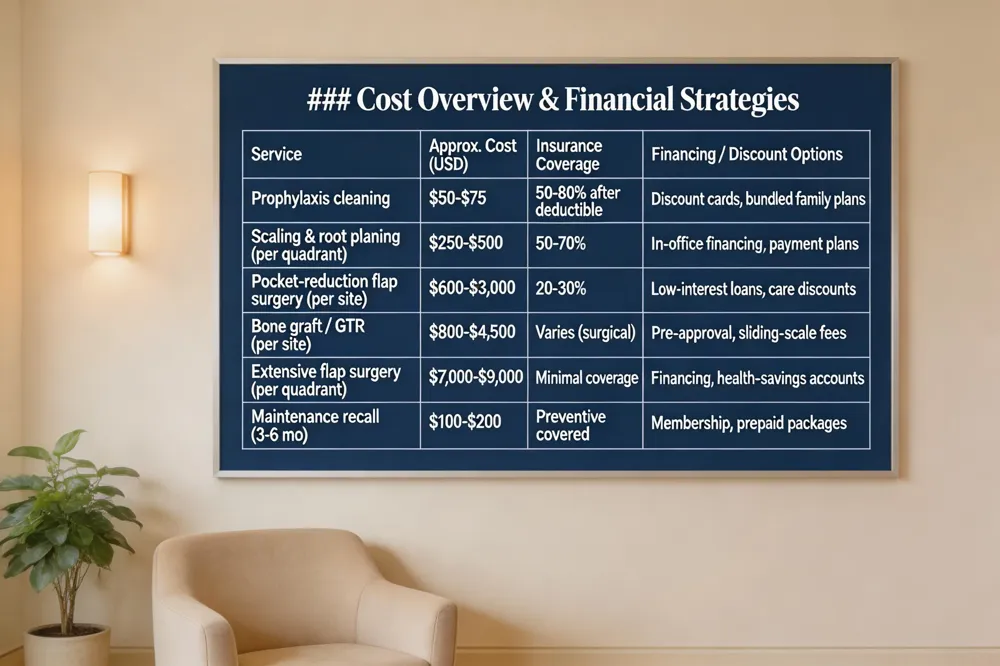 | Pocket‑reduction flap surgery (per site) | $600‑$3,000 | Limited, often 20‑30 % | Low‑interest loans, care‑of‑care discounts. |