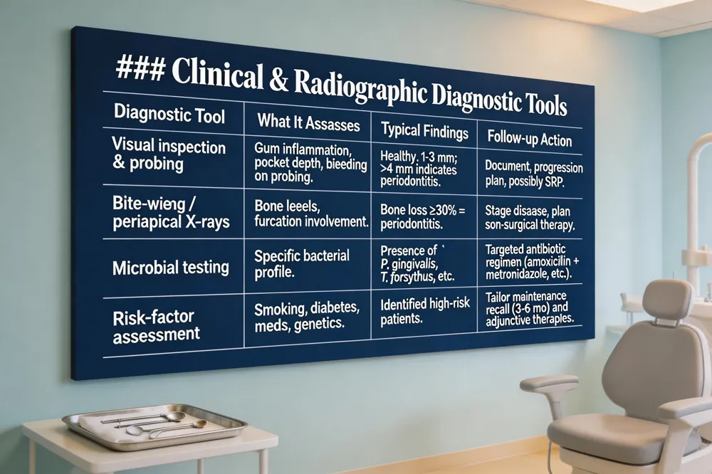 A thorough clinical exam starts with a visual inspection of the gums, probing pocket depths (1‑3 mm is healthy, >4 mm suggests periodontitis) and checking for bleeding on probing. Radiographic assessment with bite‑wing or periapical X‑rays reveals bone loss and helps stage the disease. Together these findings guide a personalized treatment‑plan PDF that outlines risk factors (smoking, diabetes, medications), the sequence of therapy—initial scaling and root planing, oral‑hygiene instruction, re‑evaluation, any needed surgery—and a maintenance recall schedule (every 3‑6 months). Evidence‑based antibiotic use is reserved for aggressive or refractory cases. The preferred regimen is amoxicillin + metronidazole; clindamycin replaces amoxicillin in penicillin‑allergic patients, and low‑dose doxycycline (20 mg twice daily) can be added for host‑modulation. Antibiotics complement, not replace, mechanical debridement and should be chosen based on microbial testing and clinical judgment.
