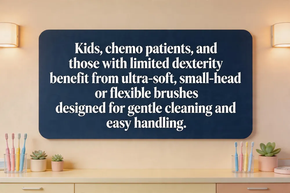 Chemo patients: chemotherapy can cause mucositis and heightened sensitivity, so a supersoft, narrow‑head brush (Biotene® Supersoft, Sensodyne® Extra‑Soft, Colgate® 360 Sensitive Compact) minimizes trauma while cleaning all surfaces. Change the brush every 3–4 months, or sooner if worn, and pair with fluoride toothpaste for added decay protection.