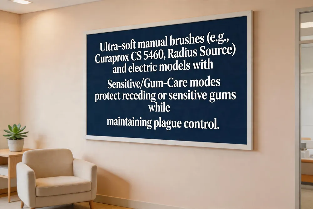 Adults should select ultra‑soft brushes (e.g., Colgate Gum Expert Ultra Soft) or electric models with pressure sensors and a dedicated “Sensitive” mode. Maintain a 45‑degree angle, gentle circular motions, and a two‑minute timer for optimal gum health.