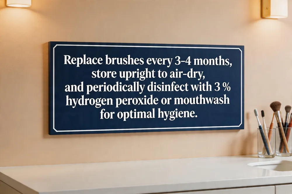 A healthy oral‑care routine starts with a proper replacement schedule: swap your brush every three to four months, or sooner if the bristles look frayed or matted. When storing, keep the brush upright and let it air‑dry; a moist, closed container encourages bacterial growth. For an extra clean brush, soak it once a week in 3% hydrogen peroxide or an FDA‑cleared mouthwash—studies show this can cut bacterial load by about 85%.