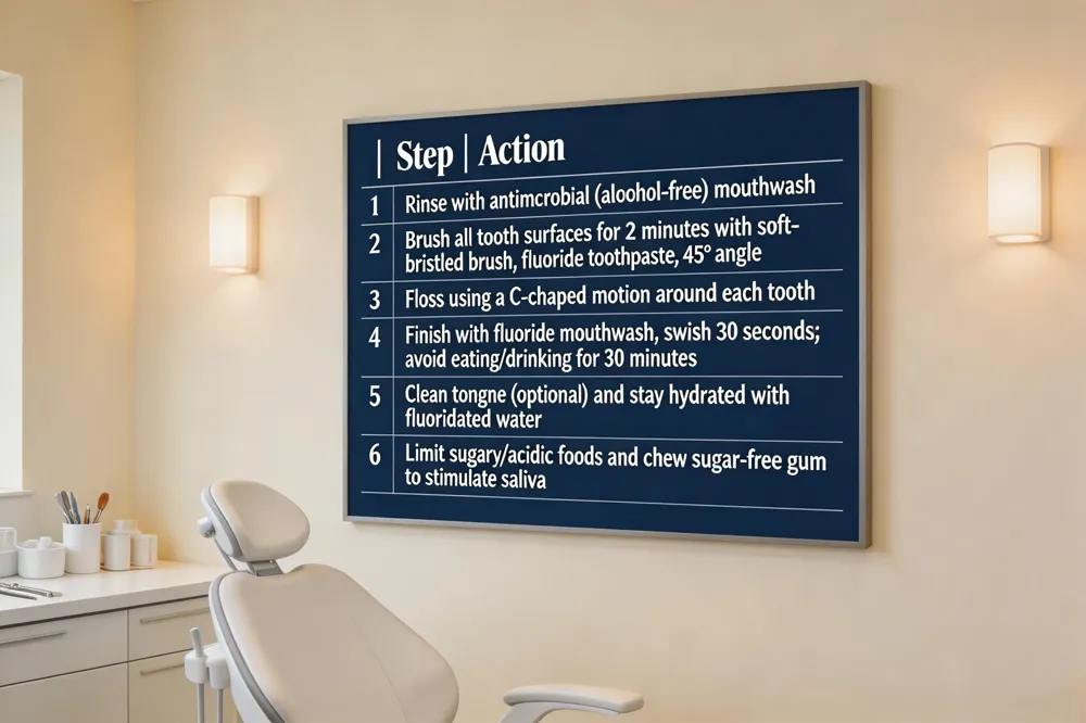 - Finish with fluoride mouthwash, swish 30 seconds; avoid food/drink for 30 minutes.
