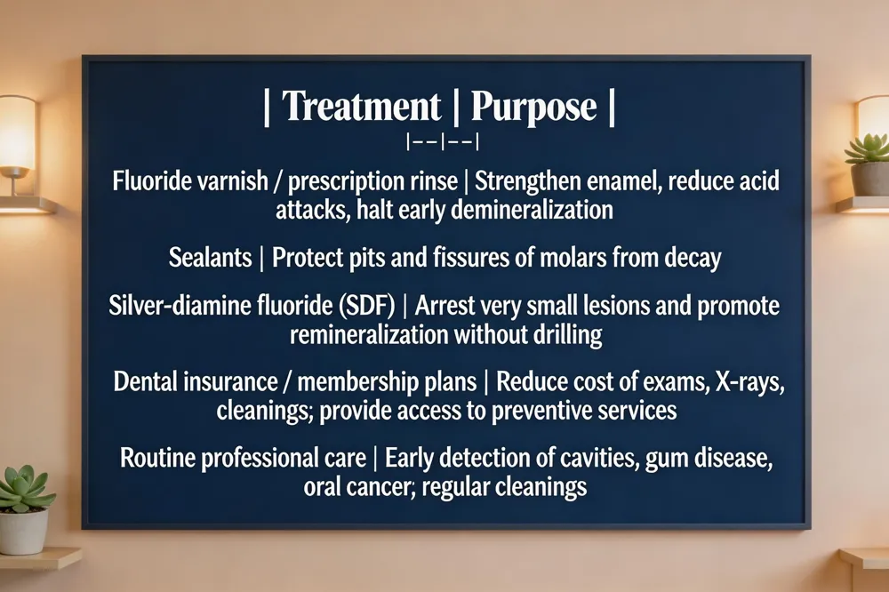 Preventive treatments such as fluoride varnish, sealants, and silver‑diamine fluoride (SDF) can halt early demineralization before a true cavity forms. Fluoride varnish or prescription‑strength fluoride mouth rinses strengthen enamel and reduce acid attacks, while sealants protect the pits and fissures of molars. For very small lesions, SDF arrests bacterial activity and encourages remineralization without drilling.
