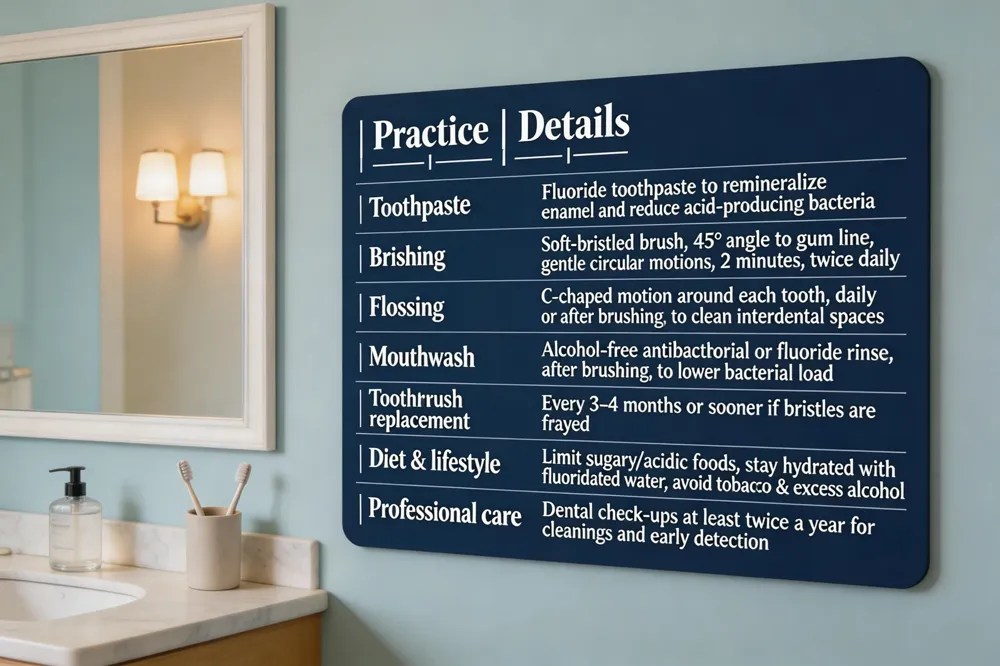 Maintain twice‑daily brushing and daily flossing, avoid tobacco and excess alcohol, stay hydrated with fluoridated water, follow a nutrient‑dense diet, and see a dentist at least once a year for early screening and professional fluoride care.