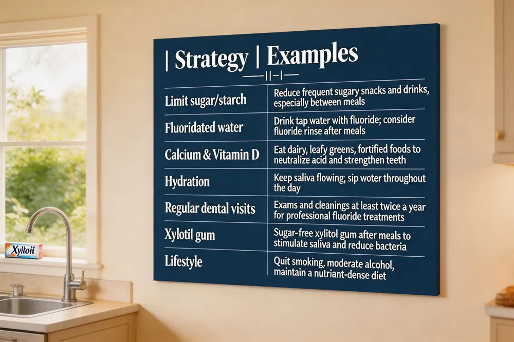 Limit frequent sugary or starchy snacks and drinks, especially between meals. Brush twice daily for two minutes with fluoride toothpaste and floss to remove plaque, letting saliva remineralize enamel. Drink fluoridated tap water and consider a fluoride rinse or sugar‑free xylitol gum after meals. Eat calcium‑rich foods, vegetables, and vitamin D sources to neutralize acid and strengthen teeth. Schedule regular dental check‑ups for professional cleanings and early detection.