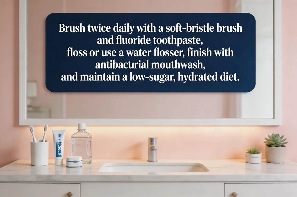 Adults: Brush twice a day with a soft‑bristled brush at a 45° angle, floss daily, limit sugar, stay hydrated with fluoridated water, avoid tobacco and moderate alcohol. Use antimicrobial mouthwash and sugar‑free gum to boost saliva.