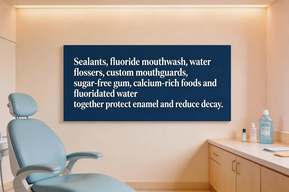 Dental sealants act as a protective coating on molar pits, cutting cavity risk by up to 80 %. Pair them with daily fluoride mouthwash to reinforce enamel after brushing. For hard‑to‑reach areas, water flossers efficiently disrupt plaque without the dexterity demands of traditional floss. Custom‑fitted mouthguards guard against night‑time grinding and sports injuries, while sugar‑free gum stimulates saliva, neutralizing acids and clearing debris. A diet rich in calcium‑dense dairy, crunchy vegetables, and fluoridated water supports strong enamel; limiting sugary or acidic foods prevents demineralization.