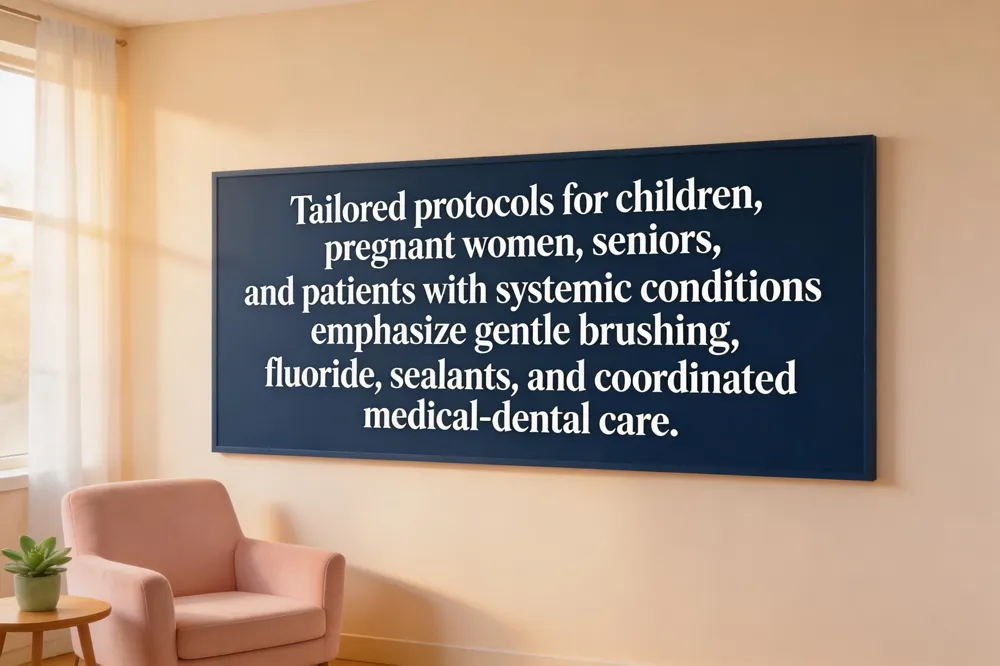 Elderly: Age‑related dry mouth and gum recession increase decay risk; stay hydrated, use fluoride mouthwash, and schedule six‑month cleanings to remove tartar and monitor bone loss.