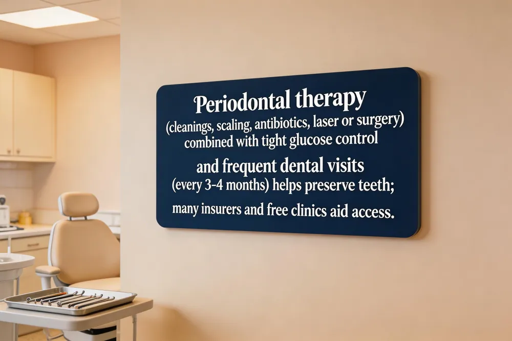 People with diabetes face a three‑fold higher chance of gum disease, but targeted care can break this cycle. • Periodontal therapy options: First, improve blood‑sugar control, then professional cleanings (scaling and root planing) remove plaque above and below the gum line. For moderate‑to‑severe periodontitis, periodontists may add localized antibiotics, laser treatment, or surgical pocket reduction to restore bone support. • Cleaning frequency for diabetics: Because inflammation progresses faster, most experts recommend dental cleanings every 3‑4 months, rather than the usual six‑month schedule, with quarterly check‑ups to monitor pocket depths. • Insurance coverage and free clinics: Many dental plans cover 80‑100 % of preventive visits; state and local health departments list sliding‑scale or charitable clinics—especially in the Greater Boston area—where high‑risk diabetic patients receive low‑cost or free care. • Tooth health preservation: Maintaining tight glucose control, quitting smoking, staying hydrated, and practicing twice‑daily brushing with fluoride toothpaste plus daily flossing protect teeth and gums, reducing cavities, dry mouth, and tooth loss. Coordinating care between your dentist and diabetes team ensures the best outcomes.