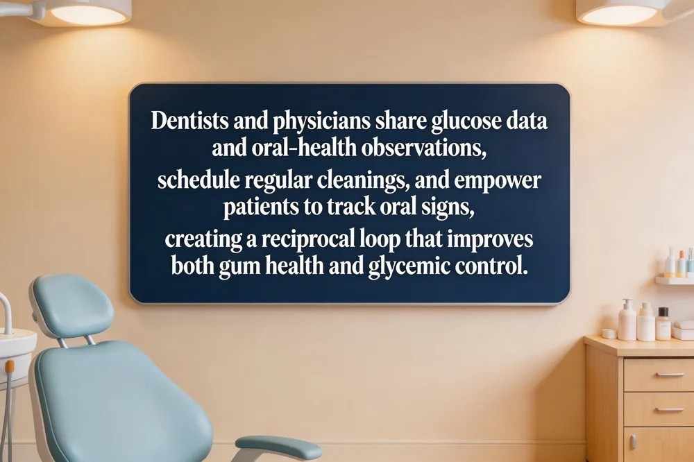 Effective long‑term gum health for people with diabetes hinges on seamless teamwork between the dentist and the patient’s physician. Together they review blood‑glucose logs, HbA1c results, and medication changes to schedule appropriate dental cleanings—often every three to four months for high‑risk patients. Patients are empowered to monitor oral signs (bleeding, swelling, bad breath) and to record daily oral‑hygiene habits, sharing this information at each visit. Regular follow‑up appointments allow early detection of gingivitis or periodontitis, timely adjustments to treatment plans, and reinforcement of self‑care, creating a reciprocal loop where better gum health supports improved glycemic control and vice‑versa.