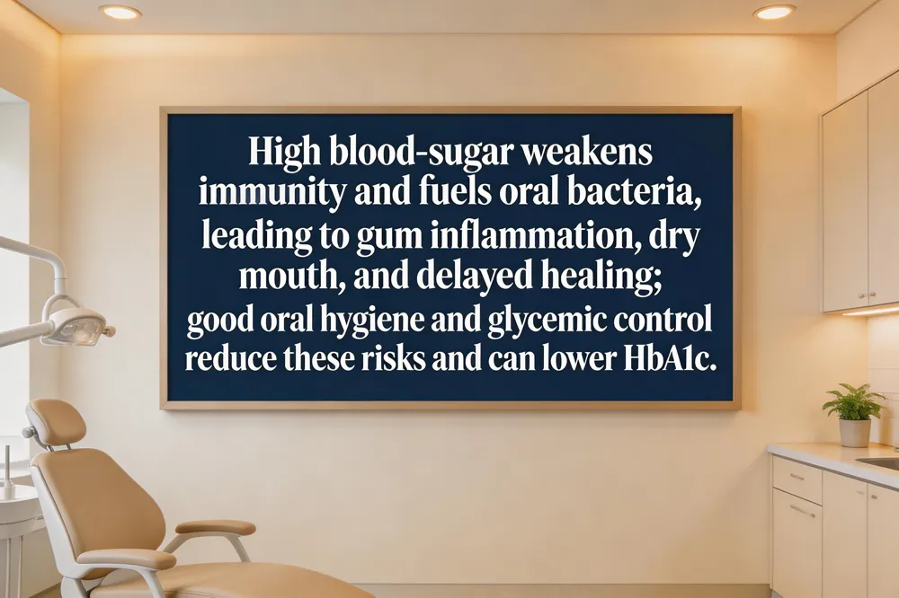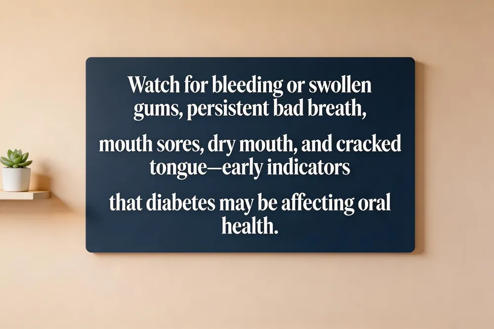 High blood‑sugar levels weaken immune defenses and increase glucose in saliva, fostering bacterial growth and plaque. This leads to gingivitis, periodontal disease, dry mouth, thrush, and delayed healing. Early warning signs—bleeding gums, persistent bad breath, receding gums, loose teeth, or mouth sores—should prompt a dental visit. Maintaining target glucose, brushing twice daily with fluoride toothpaste, flossing, staying hydrated, and seeing a dentist regularly help protect both oral and overall health.