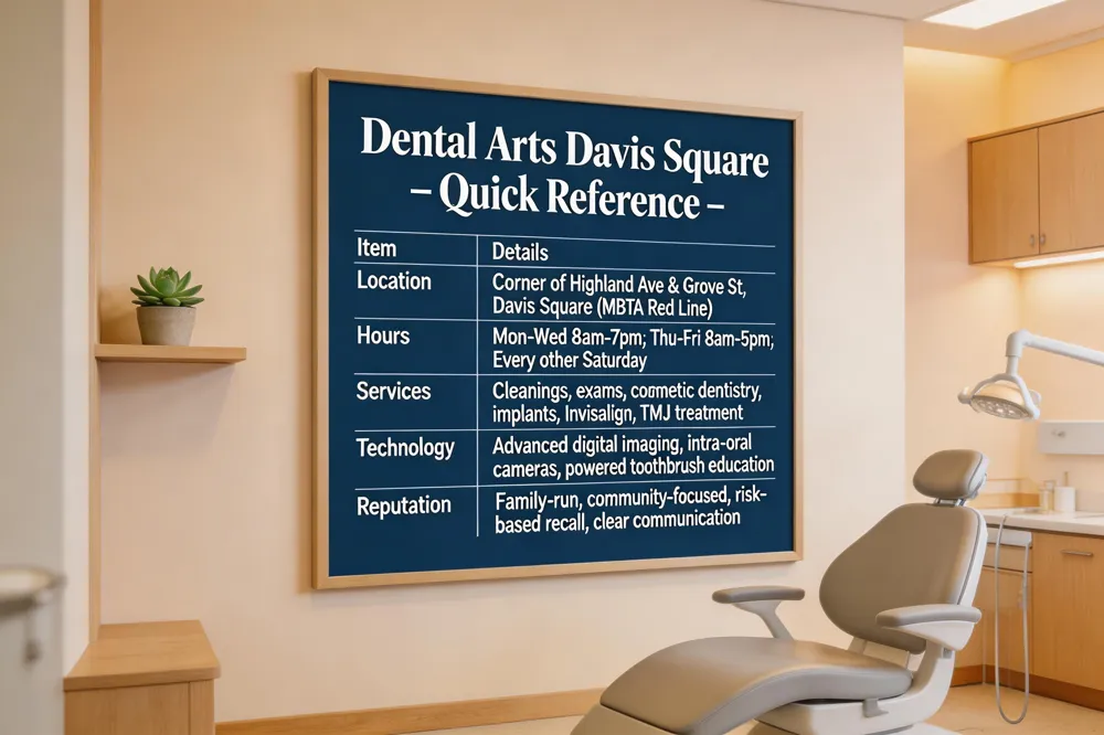 | If you’re looking for a dentist in Somerville’s Davis Square, Dental Arts Davis Square offers a convenient location right at the corner of Highland Avenue and Grove Street, just a short walk from the MBTA Red Line. The practice keeps office hours flexible—8 am‑7 pm Monday through Wednesday, 8 am‑5 pm Thursday and Friday, and every other Saturday—so families and professionals can fit appointments into busy schedules. |