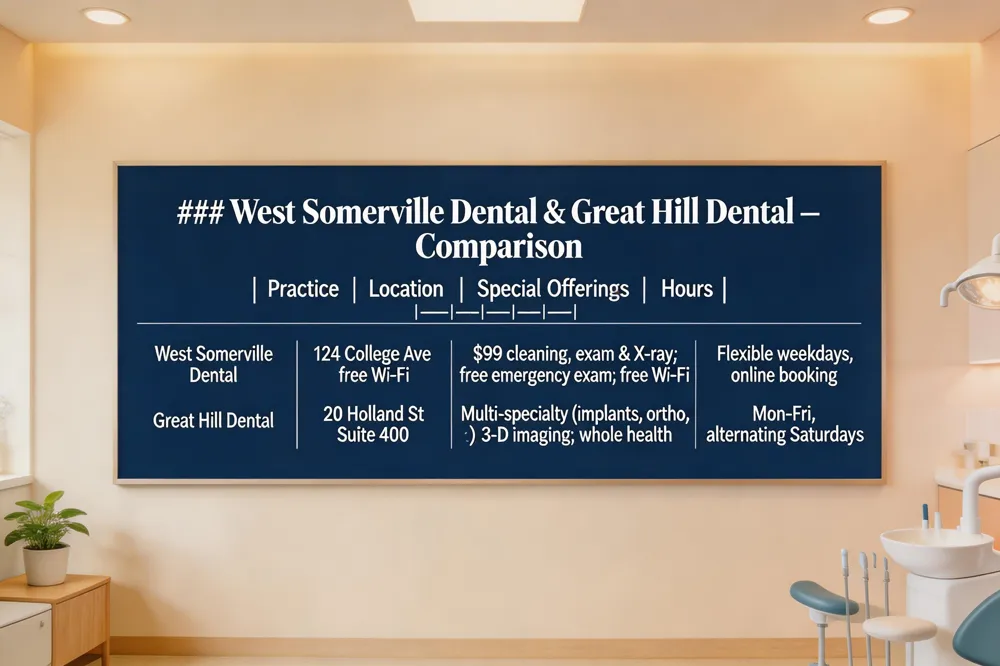 Both offices prioritize accessibility: West Somerville Dental’s special pricing and easy online booking, and Great Hill Dental’s extended hours and comprehensive insurance participation make high‑quality, personalized dental care attainable for every Somerville family.