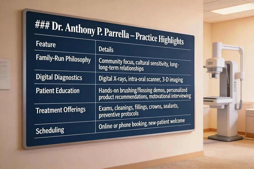 | Family‑run clinic philosophy – Dr. Anthony P. Parrella’s practice is a family‑run office in Somerville that stress community, trust and personalized care. The team treats every patient as a neighbor, listening to concerns, respecting cultural preferences and building long‑term relationships that support consistent oral‑health habits. |
