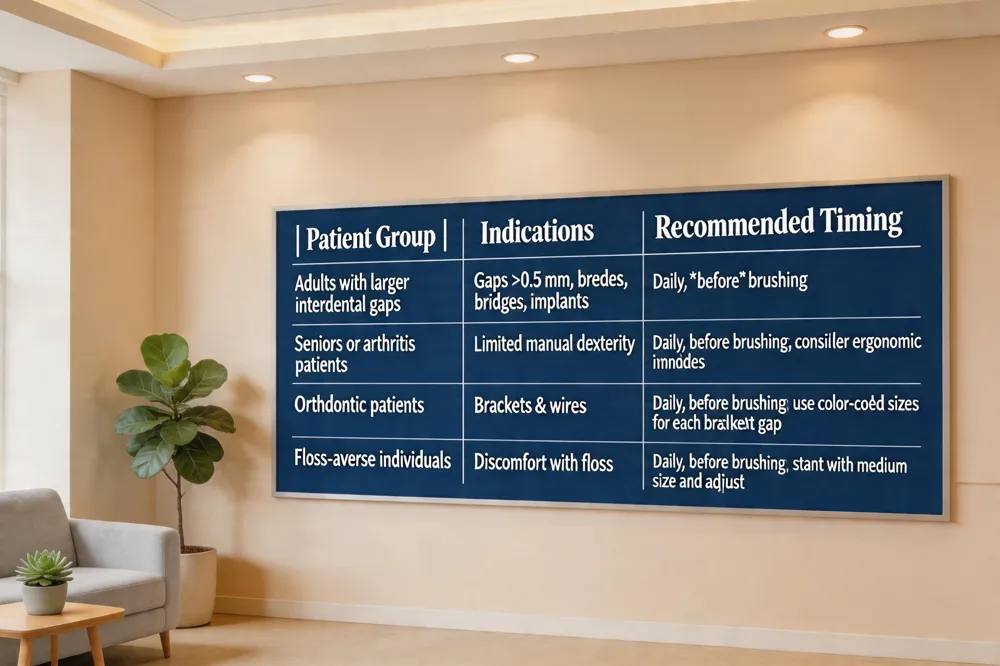 | Orthodontic patients | Brackets & wires | Daily, before brushing; use color‑coded sizes for each bracket gap |