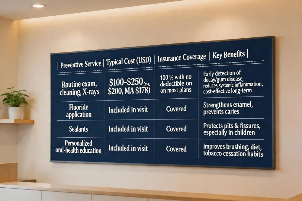 A typical preventive visit—exam, cleaning, and X‑rays—costs $100‑$250 nationally (average $200; Massachusetts $178). Most dental plans cover these services at 100 % with no deductible, so patients often pay little or nothing out‑of‑pocket. Regular six‑month cleanings help avoid costly emergency treatment later, making preventive care both health‑wise and economical.