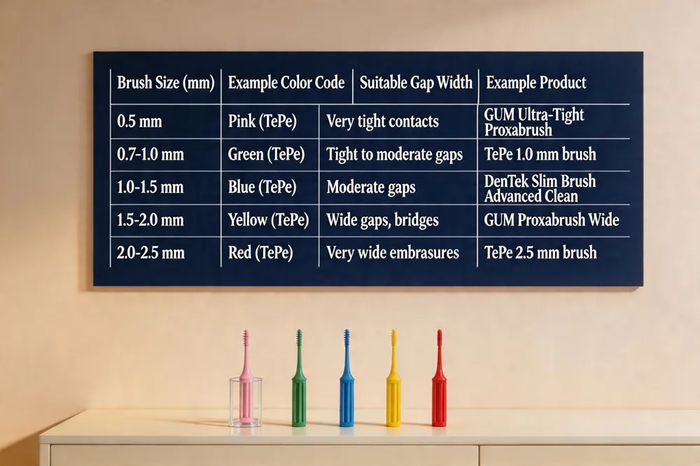 Interdental brush sizes – Brushes are offered from roughly 0.5 mm for tight contacts up to 2.5 mm for wider gaps. Color‑coded systems such as TePe’s nine‑size line or GUM’s Proxabrush series (four sizes) help patients match the brush to each space. The brush should fit snugly without forcing; any resistance or bleeding indicates a smaller size is needed.