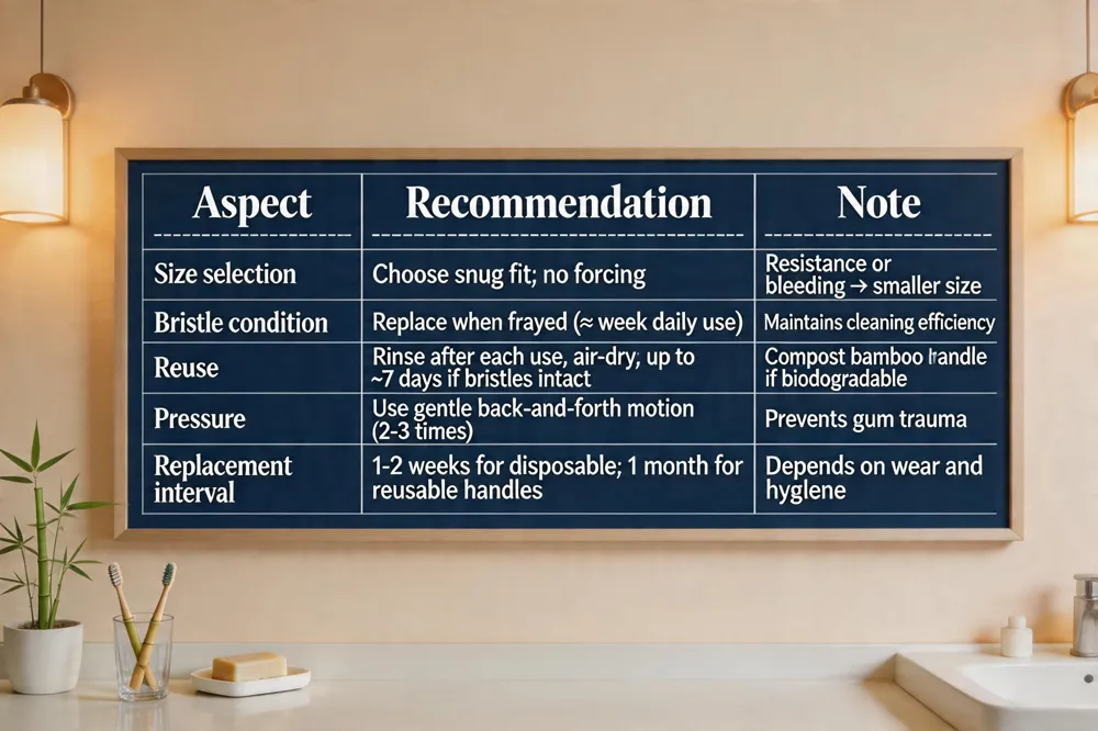 Interdental brushes are safe when used correctly—choose a size that fits snugly in each gap, avoid forcing the brush, and follow the manufacturer’s instructions. A proper fit prevents gum trauma and enamel damage; mild bleeding may appear initially but usually subsides as plaque is removed and gums heal. Reusable options are now available, often featuring a biodegradable bamboo handle and nylon or castor‑oil bristles. After each use, rinse the brush (or soak it in an antimicrobial mouthwash) and let it air‑dry; replace it when the bristles become frayed, typically after a week of daily use. While the handle can be composted, the brush itself must be discarded to maintain hygiene. Potential drawbacks include gum irritation if the wrong size is selected or if excessive pressure is applied, the need for frequent replacement (every 1–2 weeks) which can increase cost, and limited effectiveness in very tight interproximal spaces where floss or a thin pick may be preferable. In practice, an interdental brush can be reused for several days—up to about a week—provided the bristles remain intact; replace it as soon as cleaning efficiency drops. A short instructional video demonstrates gentle insertion, a back‑and‑forth motion, and proper rinsing after each use.